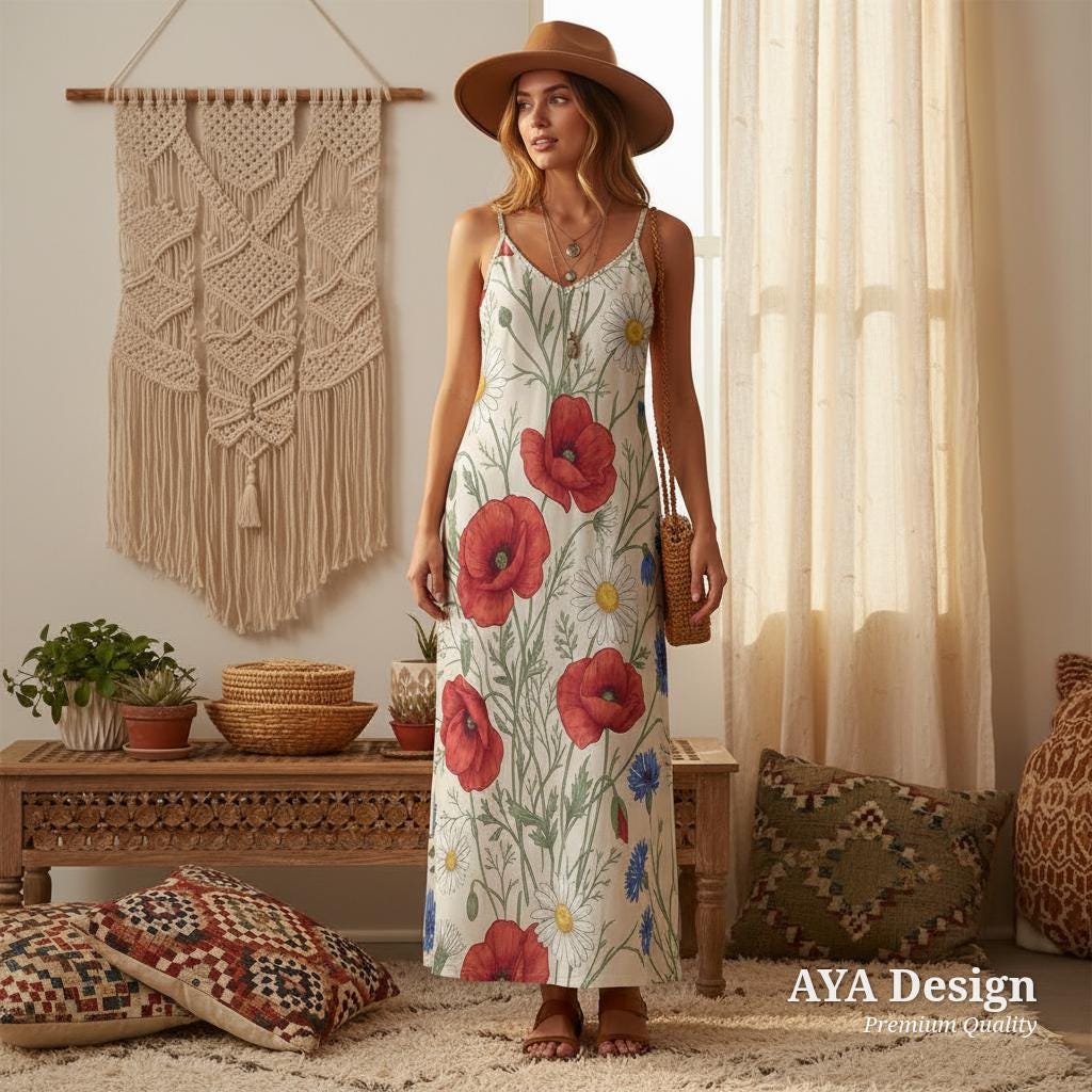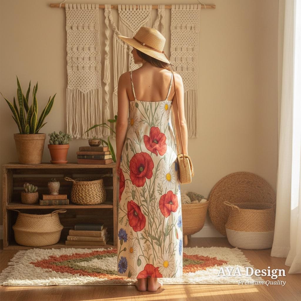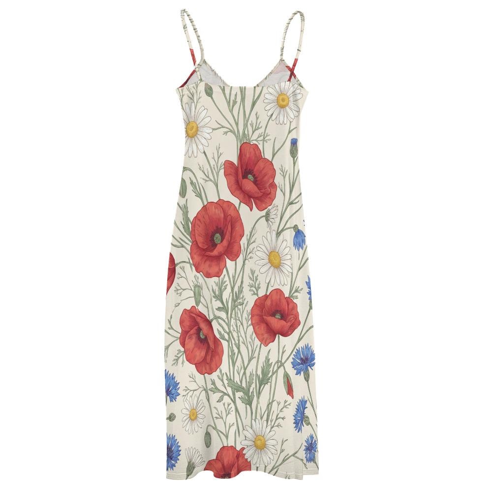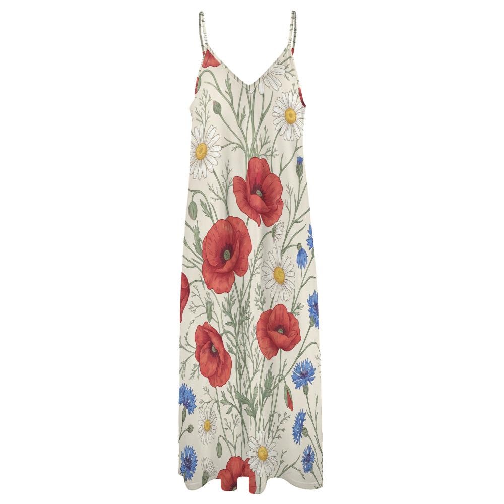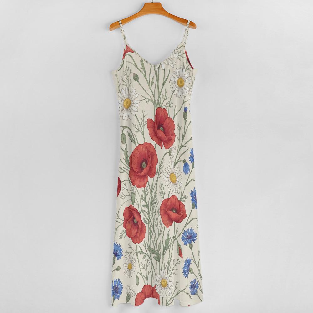 Embrace your inner romantic with our Botanical Wildflower Meadow Long Dress. Featuring a breathtaking, hand-illustrated print of vibrant red poppies, delicate white daisies, and charming blue cornflowers, this dress is essentially a wearable garden.
