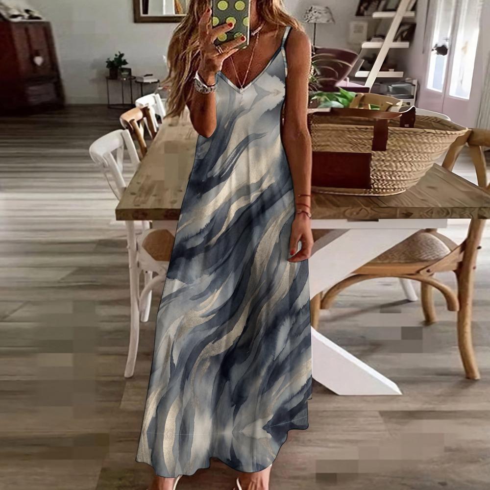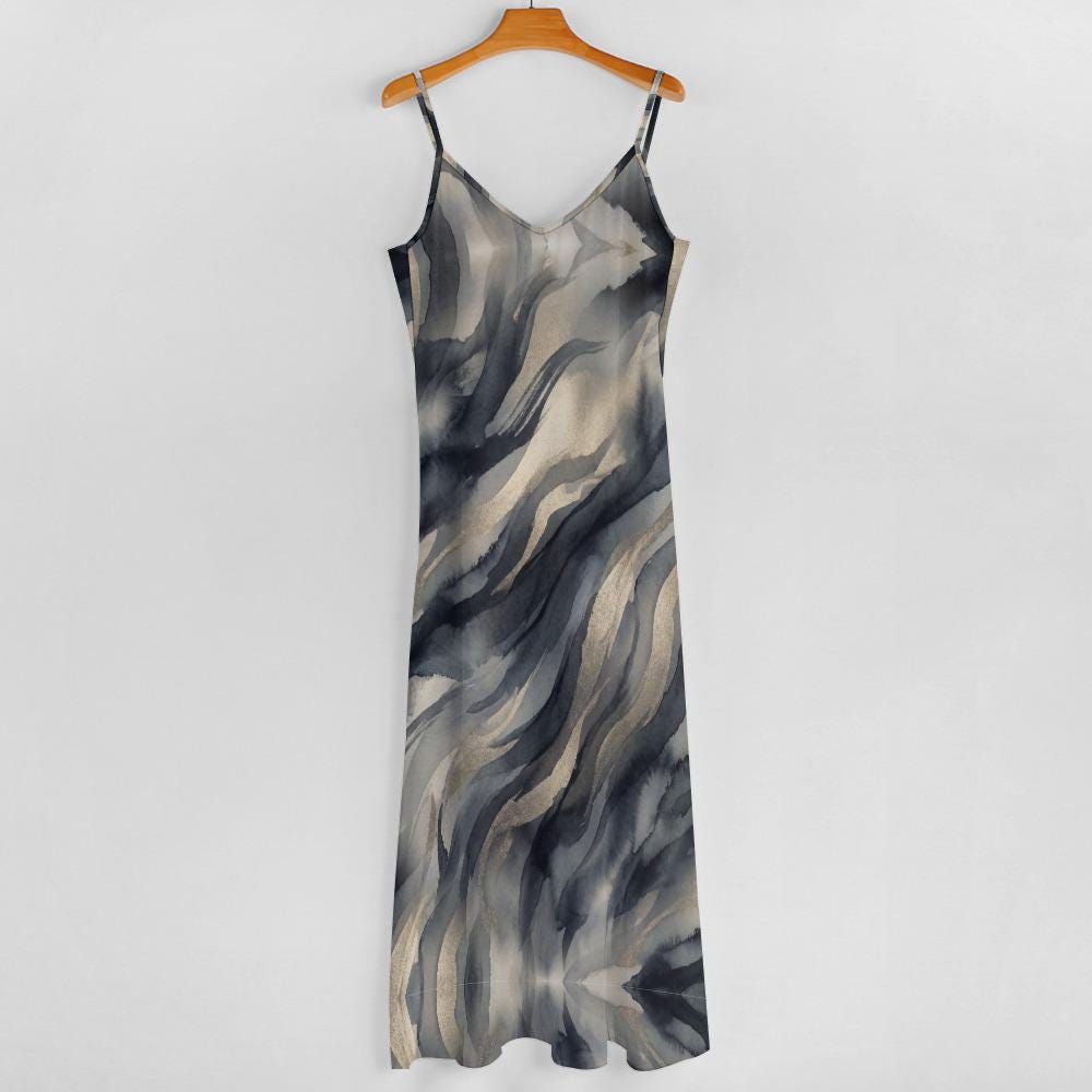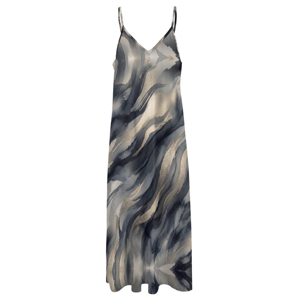 Featuring a mesmerizing, smoky marble "mist" pattern in rich navy and champagne tones, this ankle-length maxi dress drapes beautifully over your silhouette. It’s designed to make you look sleek, stunning, and utterly chic—while feeling insanely comfortable.