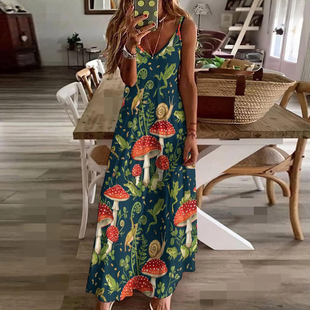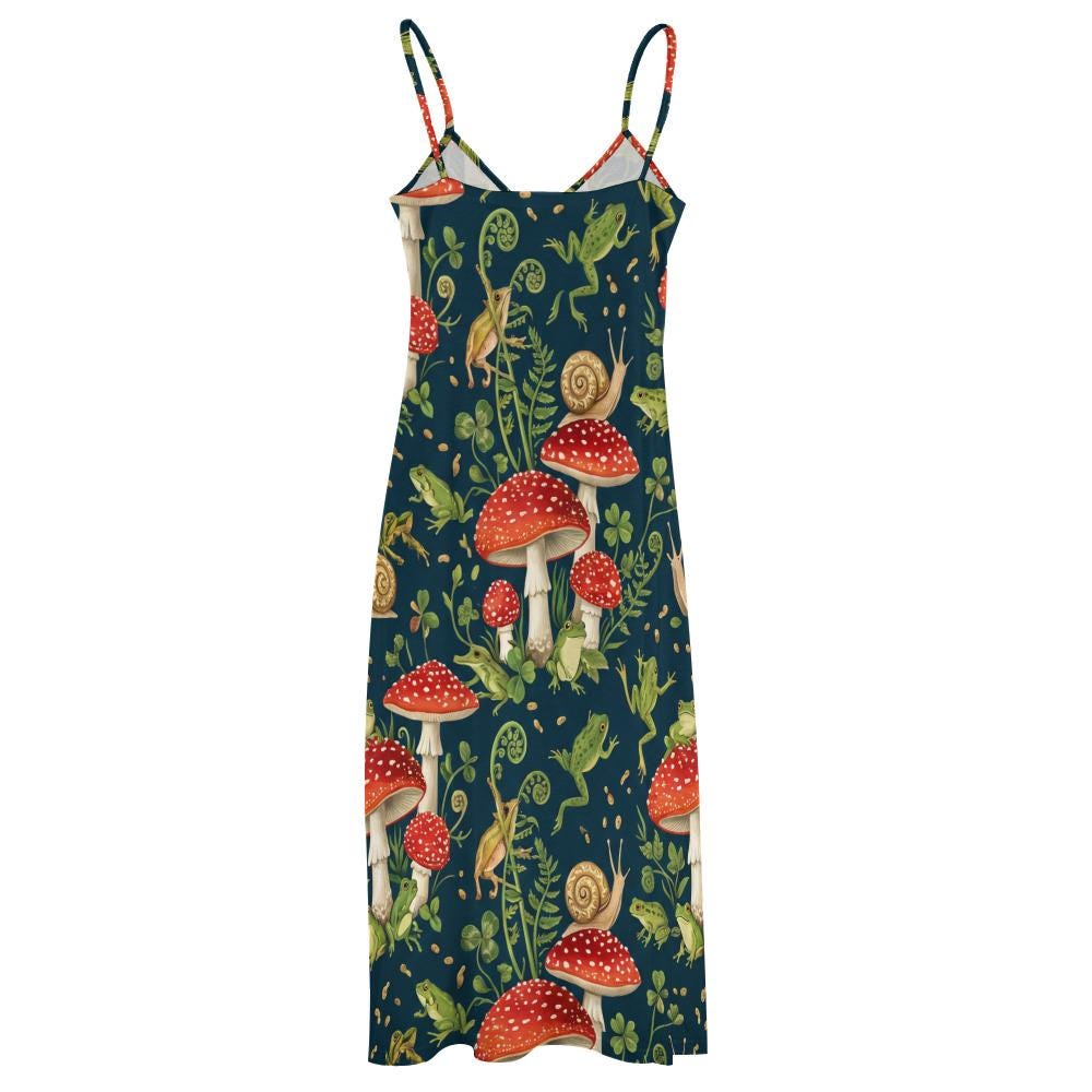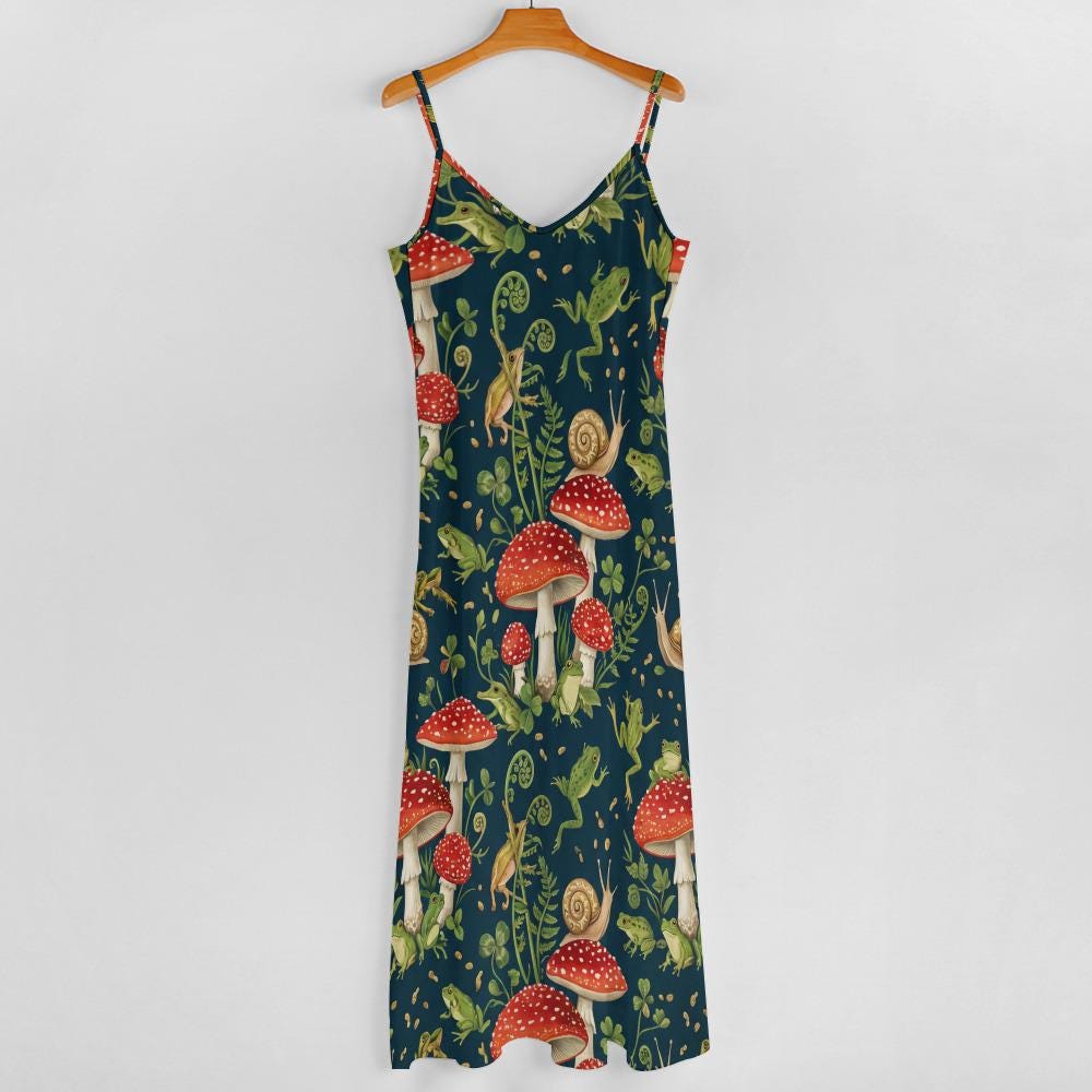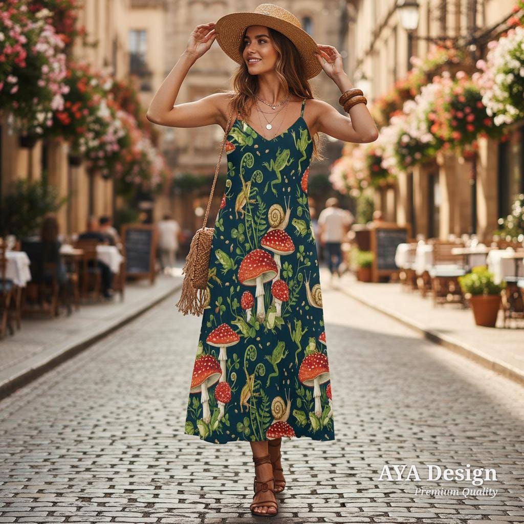 Featuring a beautifully quirky print of red amanita mushrooms, leaping green frogs, wandering snails, and curling fern fronds on a deep, moody background, this dress is the ultimate tribute to the Goblincore and Cottagecore aesthetics.