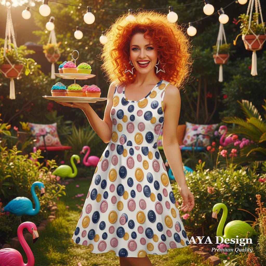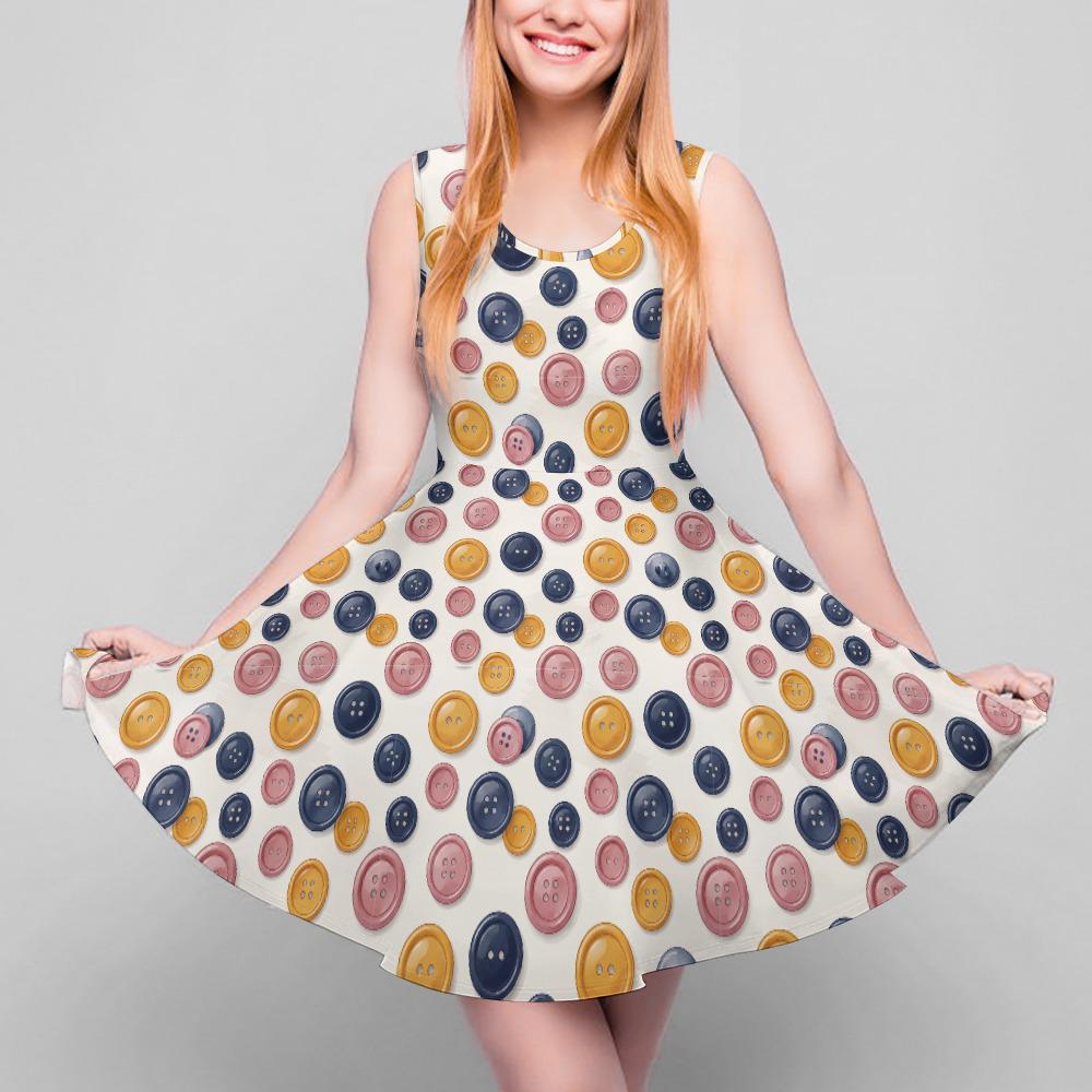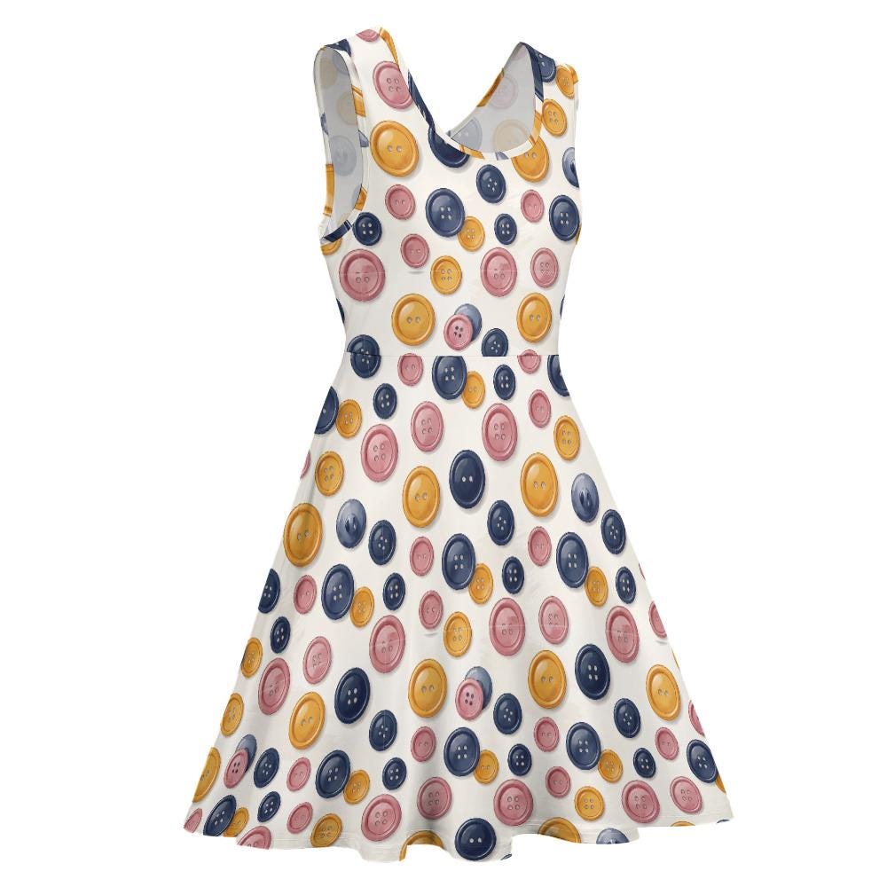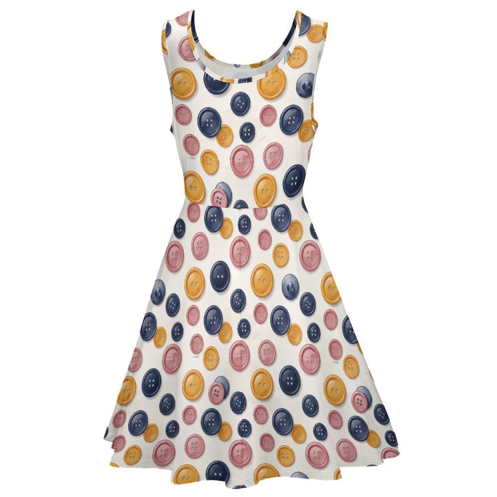 Whether you're a passionate seamstress, a weekend quilter, a creative art teacher, or just someone who loves a pop of quirky color, this Colorful Button Print Skater Dress is made to show off your unique personality.
