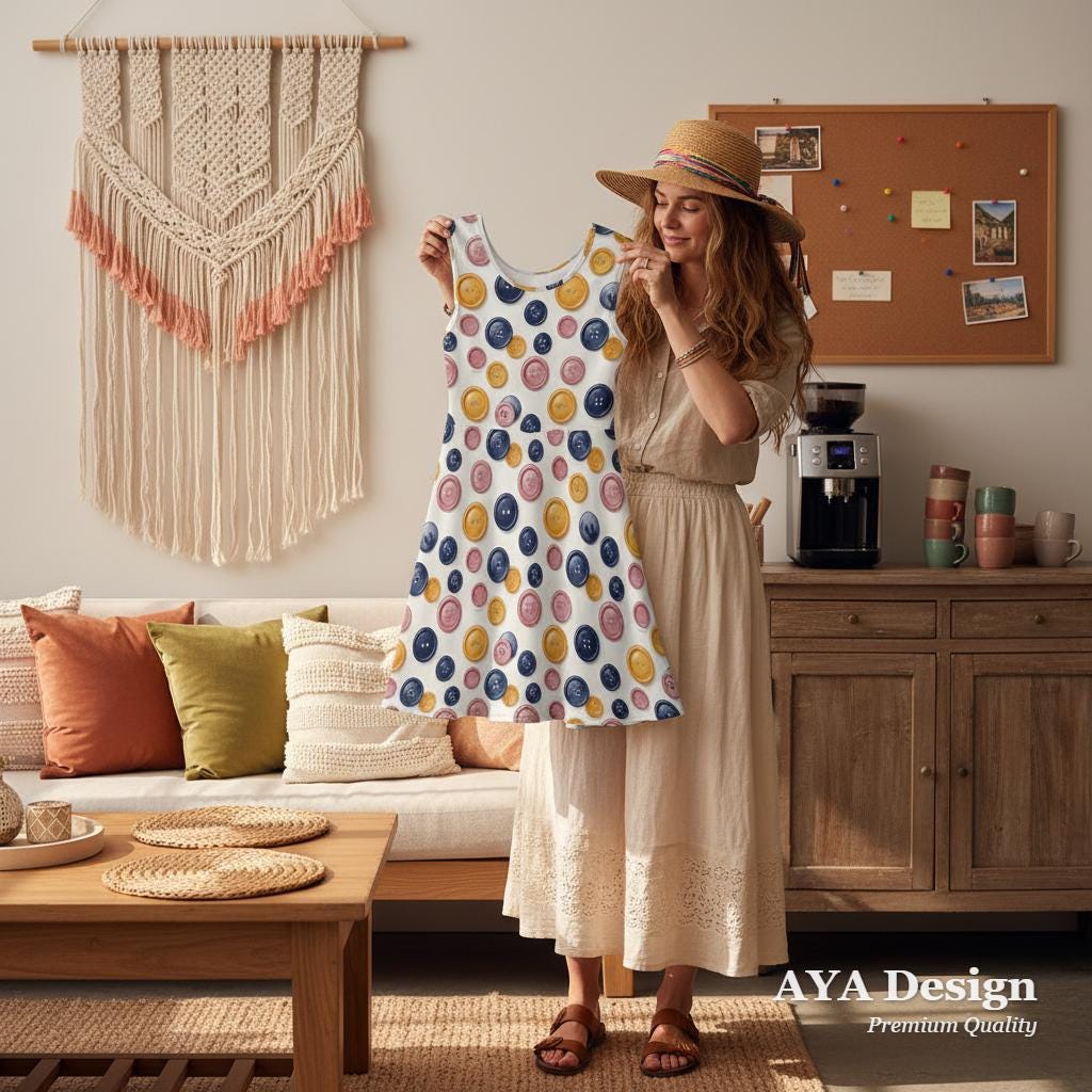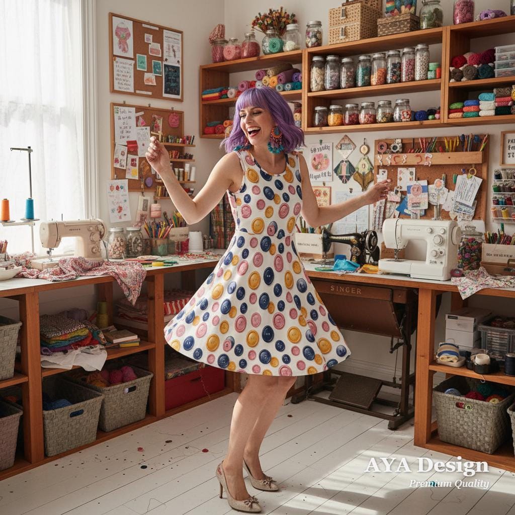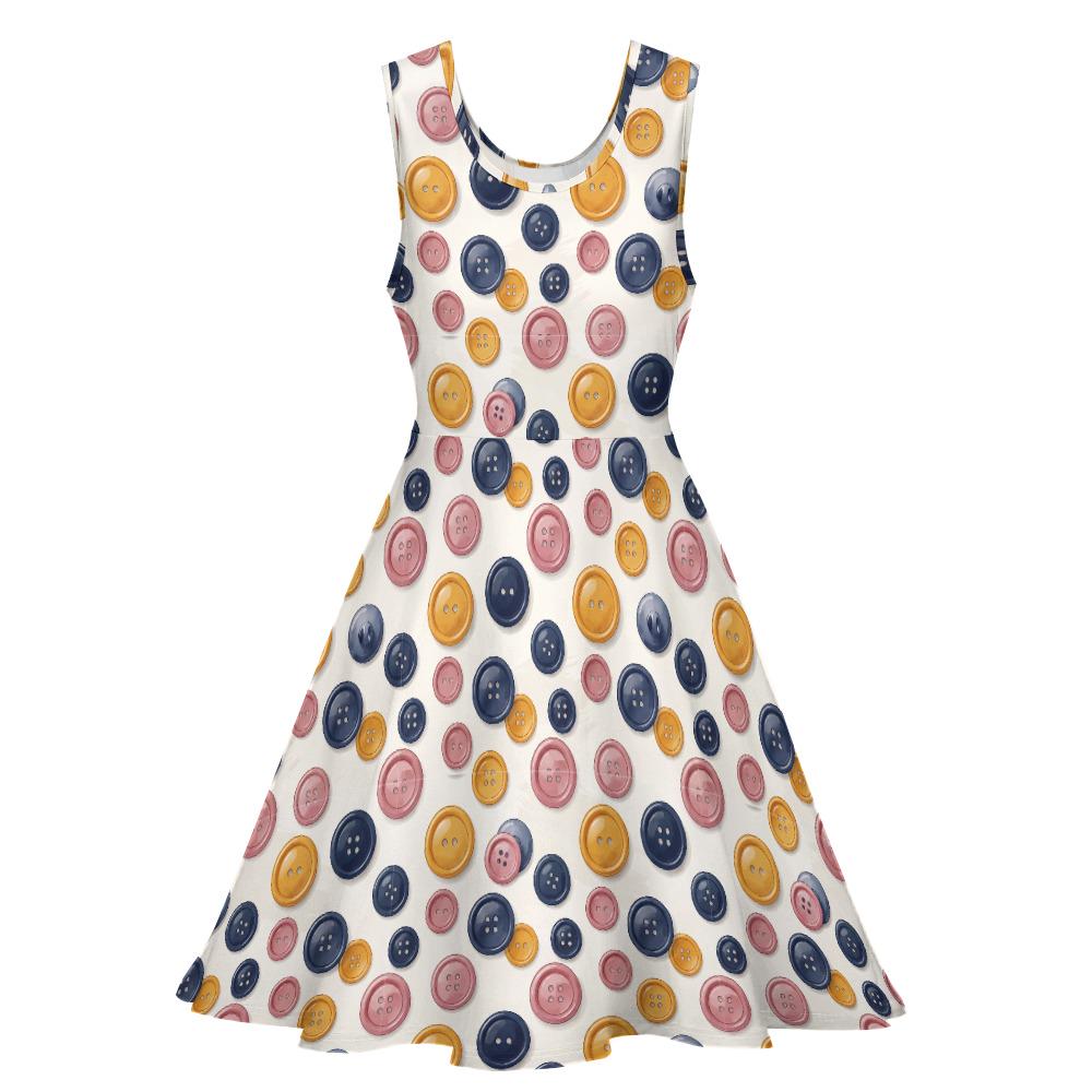 Whether you're a passionate seamstress, a weekend quilter, a creative art teacher, or just someone who loves a pop of quirky color, this Colorful Button Print Skater Dress is made to show off your unique personality.