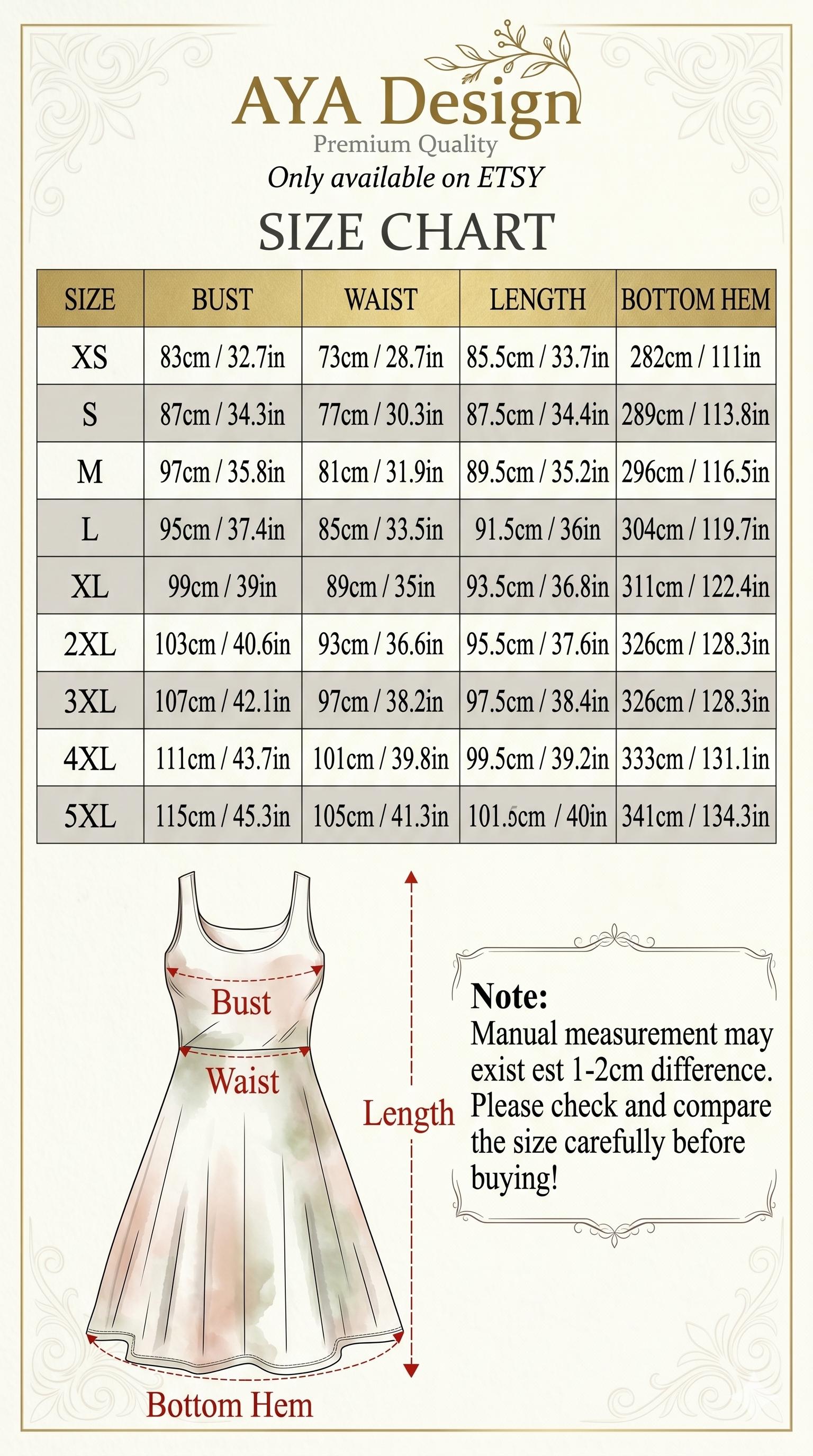 📏 Sizing & Fit (Important - Please Read!) Please note that these dresses are produced using European sizing standards, which often run slightly smaller than standard US sizing. To ensure your perfect fit, please measure yourself and compare it to our chart below before ordering!