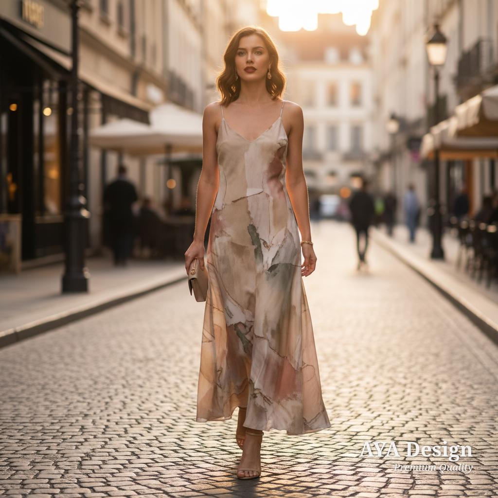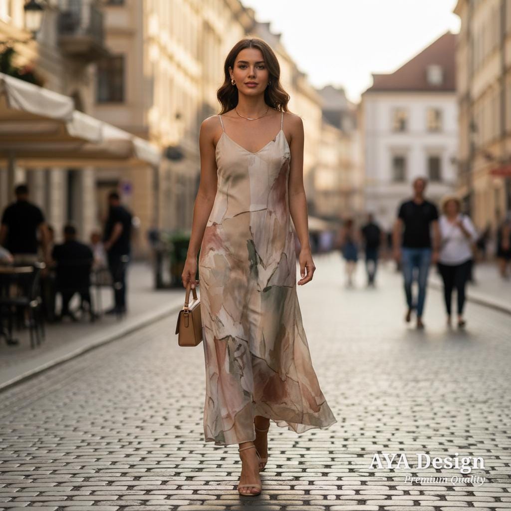 Featuring a stunning, contemporary watercolor print blending soft blush, warm beige, and sage green, this dress is designed for the modern romantic. It’s more than just a piece of clothing; it’s wearable art. Whether you are sipping espresso at a sidewalk cafe, attending a beautiful garden wedding, or just enjoying a chic weekend brunch, this versatile maxi dress guarantees you will look beautifully put-together in seconds.